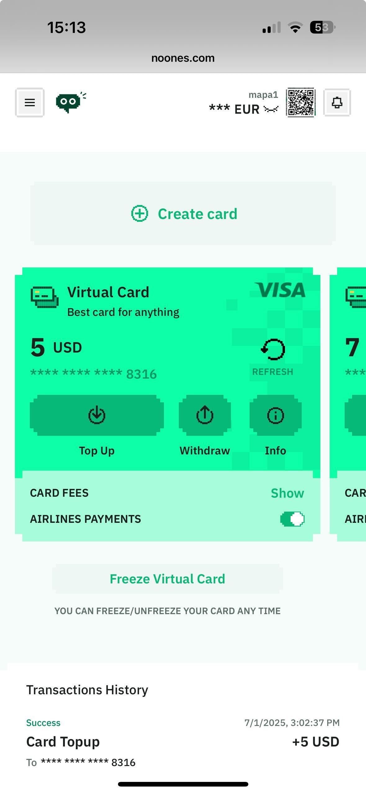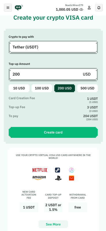 You can create NoOnes crypto Virtual VISA USD card and top up it directly from your NoOnes Wallet.
