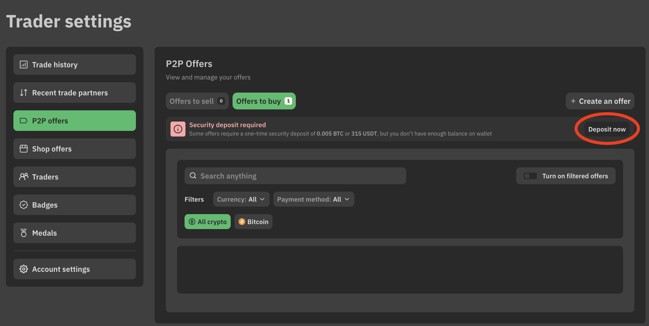 Note: You do not have to deposit BTC or USDT for each offer or payment method separately. Your deposit covers all offers.